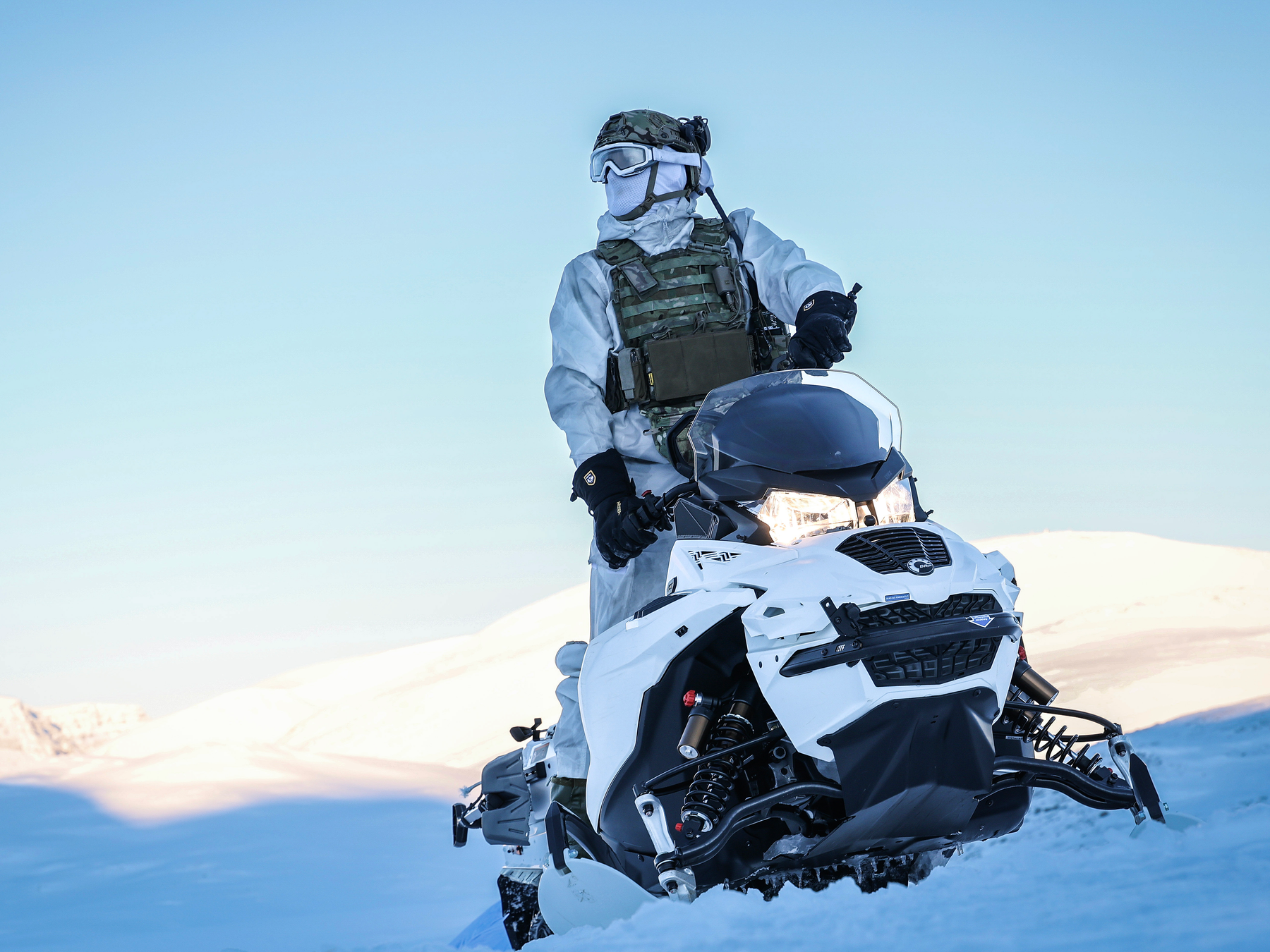 A member of 30 Commando’s Surveillance Reconnaissance Squadron (SRS) is captured operating an Oversnow Reconnaissance Vehicle (ORV) in Arctic conditions. The image highlights the mobility and adaptability of Royal Marines Commandos, navigating snow-covered terrain with specialised vehicles designed for reconnaissance and rapid movement in extreme environments.