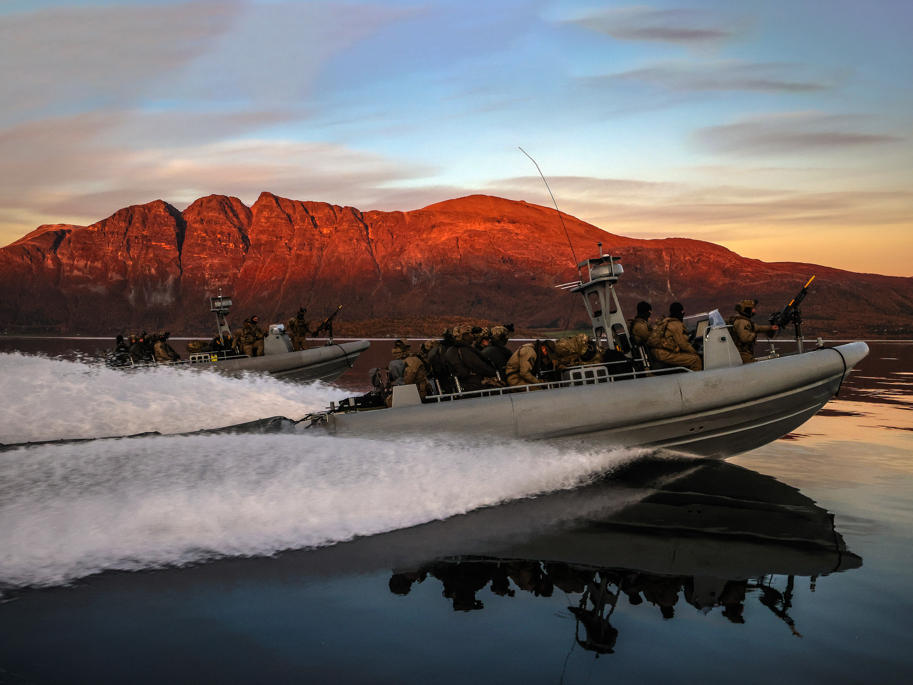 Royal Marine Commandos From 40 Commando launch from RFA Lyme Bay on a two hour transit through Norwegian Fjords with a wind chill reading of minus 10 degrees before conducting a night raid with inflatable raiding craft on a beach as they begin their exercise in Northern Norway under the guise of night.