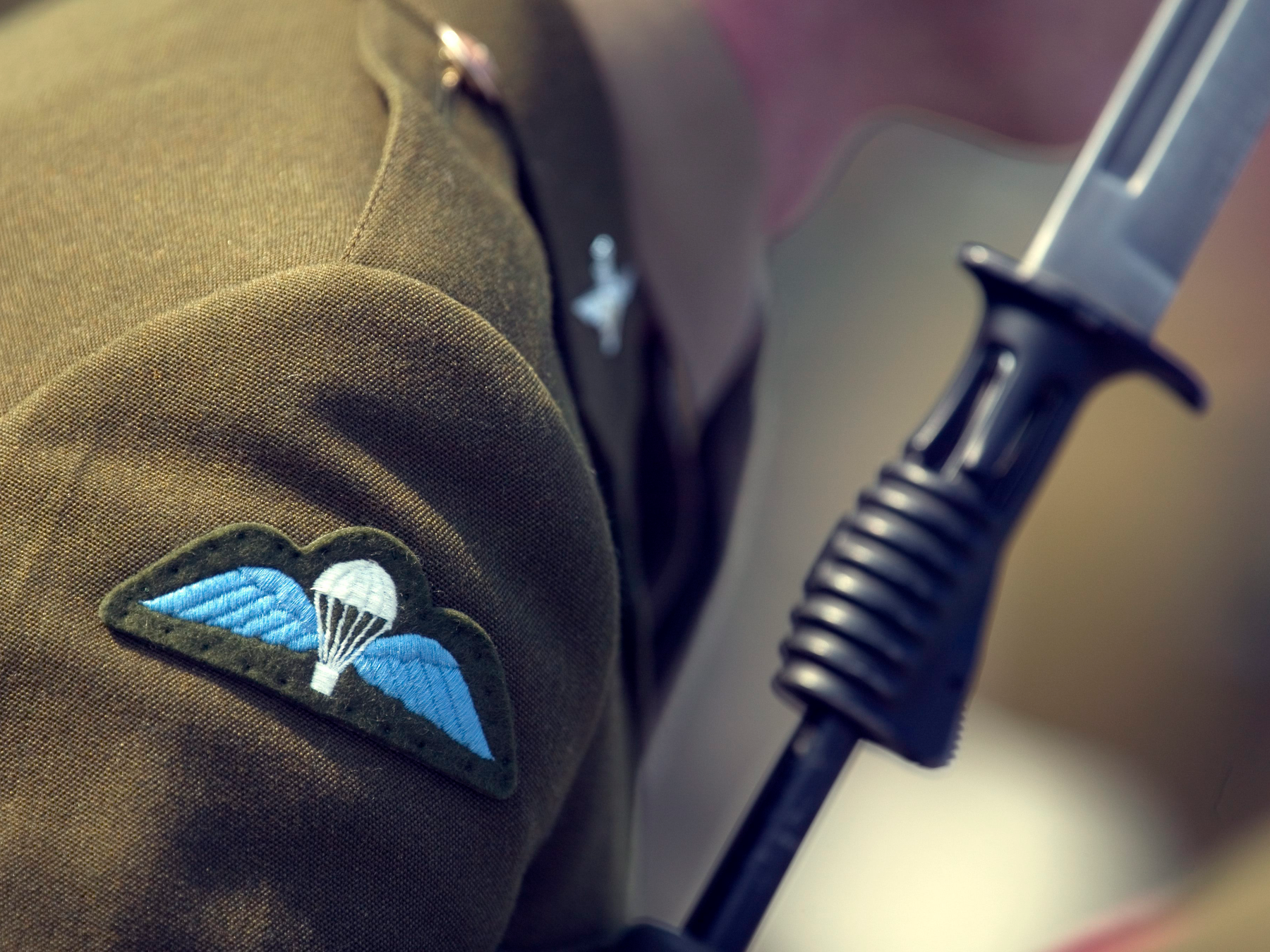 A soldier from the British Army Parachute Regiment showing a close-up of a Parachutist Badge “wings.”
