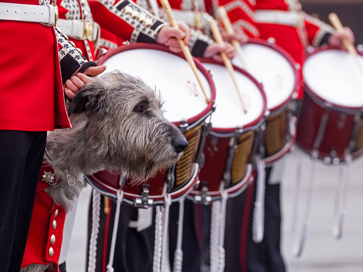 Pictured is Irish Wolfhound Turlough Mór (kennel name Séamus), the 17th Regimental Mascot of the Irish Guards. The regiment is shown on parade at Mons Barracks, Aldershot, during the Major General’s Inspection.