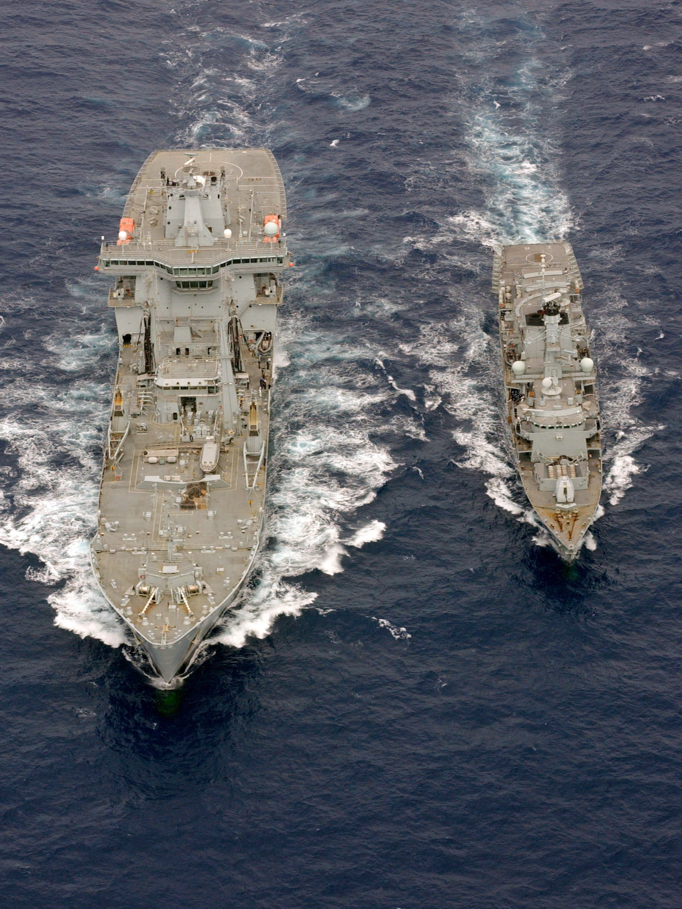 RFA Wave Ruler (A390) Royal Fleet Auxiliary Wave class Fleet Tanker carrying out a RAS with HMS Iron Duke in the Atlantic in 2006