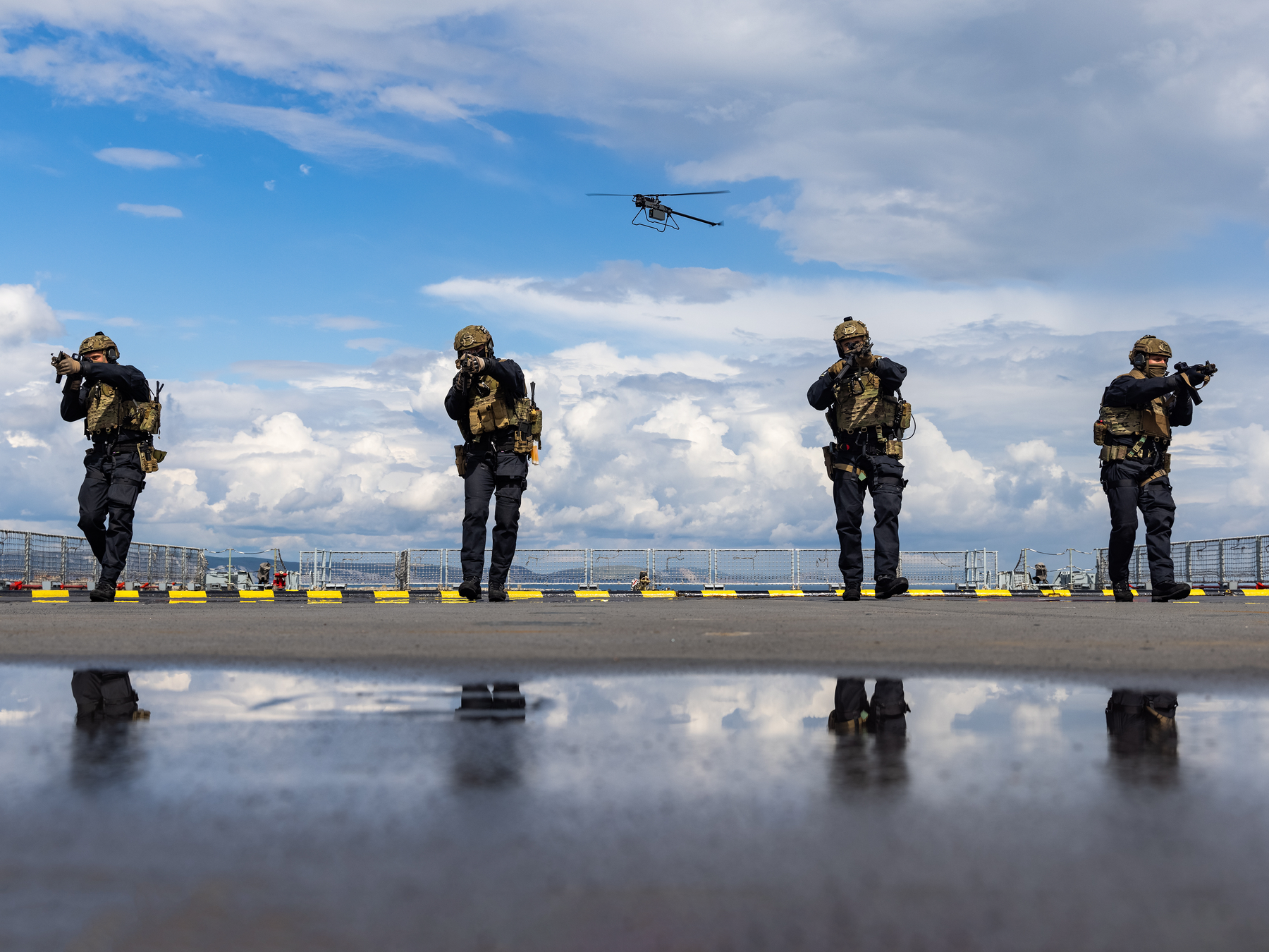 42 Commando Royal Marines Fleet Contingency Troop conducting high vertical assault drills onto RFA Mounts Bay in Portland Harbour.