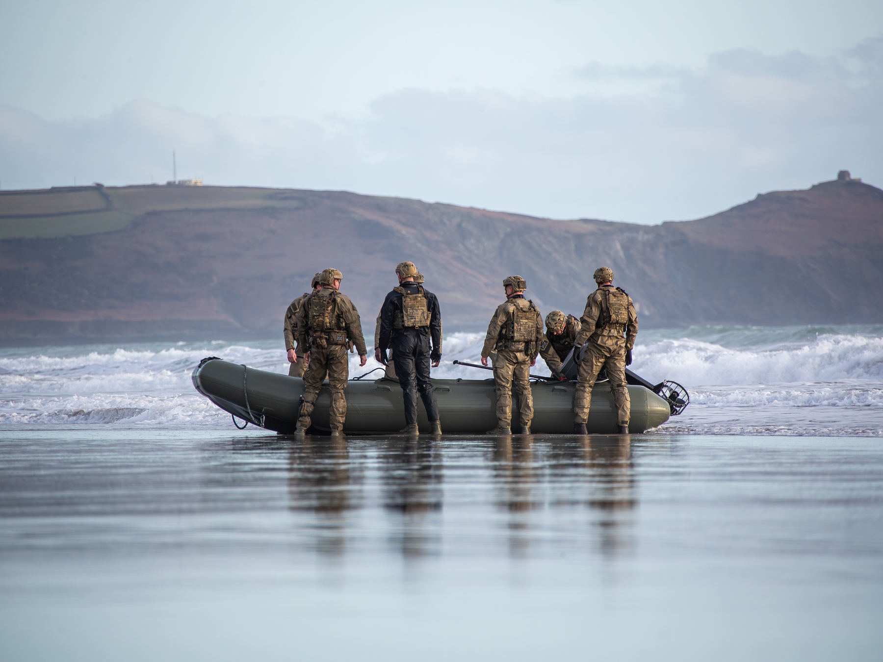Royal Marine Commandos from 47 Commando Raiding Group and elements of 40 Commando shown during training on the beaches of East Cornwall during sunset.