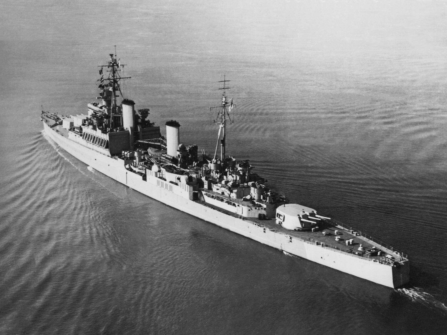 Port side View of HMS Uganda (66) Royal Navy Fiji Class Light Cruiser underway in 1944