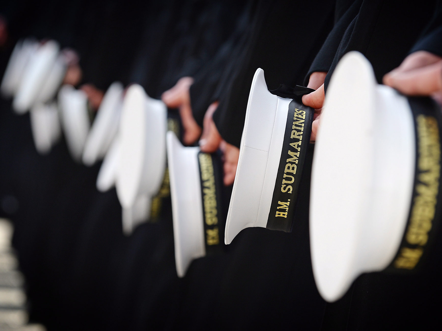 Submariners of HMS Victorious holding their caps during an inspection by the Commanding Officer.