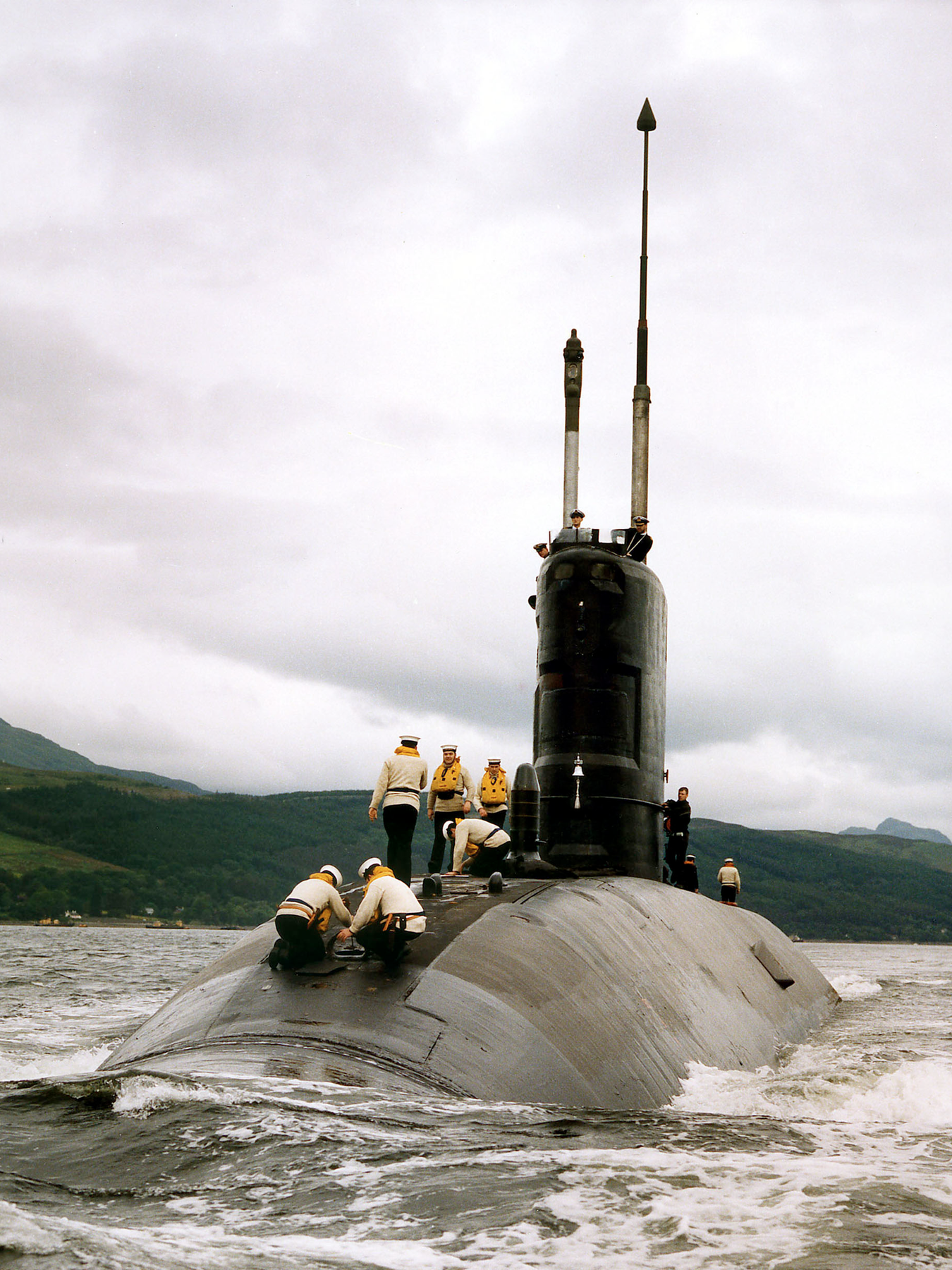 HMS Sovereign (S108) Royal Navy Swiftsure Class Submarine leaving Faslane in 1992