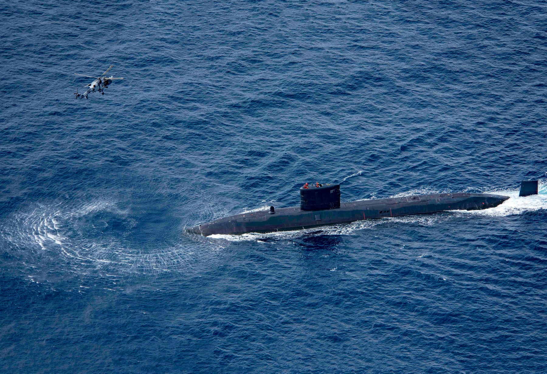 Royal Navy Trafalgar Class Submarine HMS Trenchant (S91) and Royal Navy Wildcat Helicopter, attached to Type 23 frigate HMS Iron Duke (F234), participate in a passenger exchange during exercise Saxon Warrior 2017