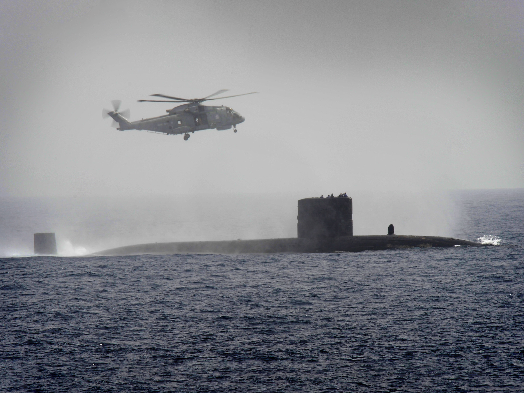 Royal Navy Trafalgar Class Fleet Submarine HMS Turbulent is pictured with the Merlin helicopter from Type 23 frigate HMS St Albans, during an anti-submarine exercise in the Gulf of Oman.