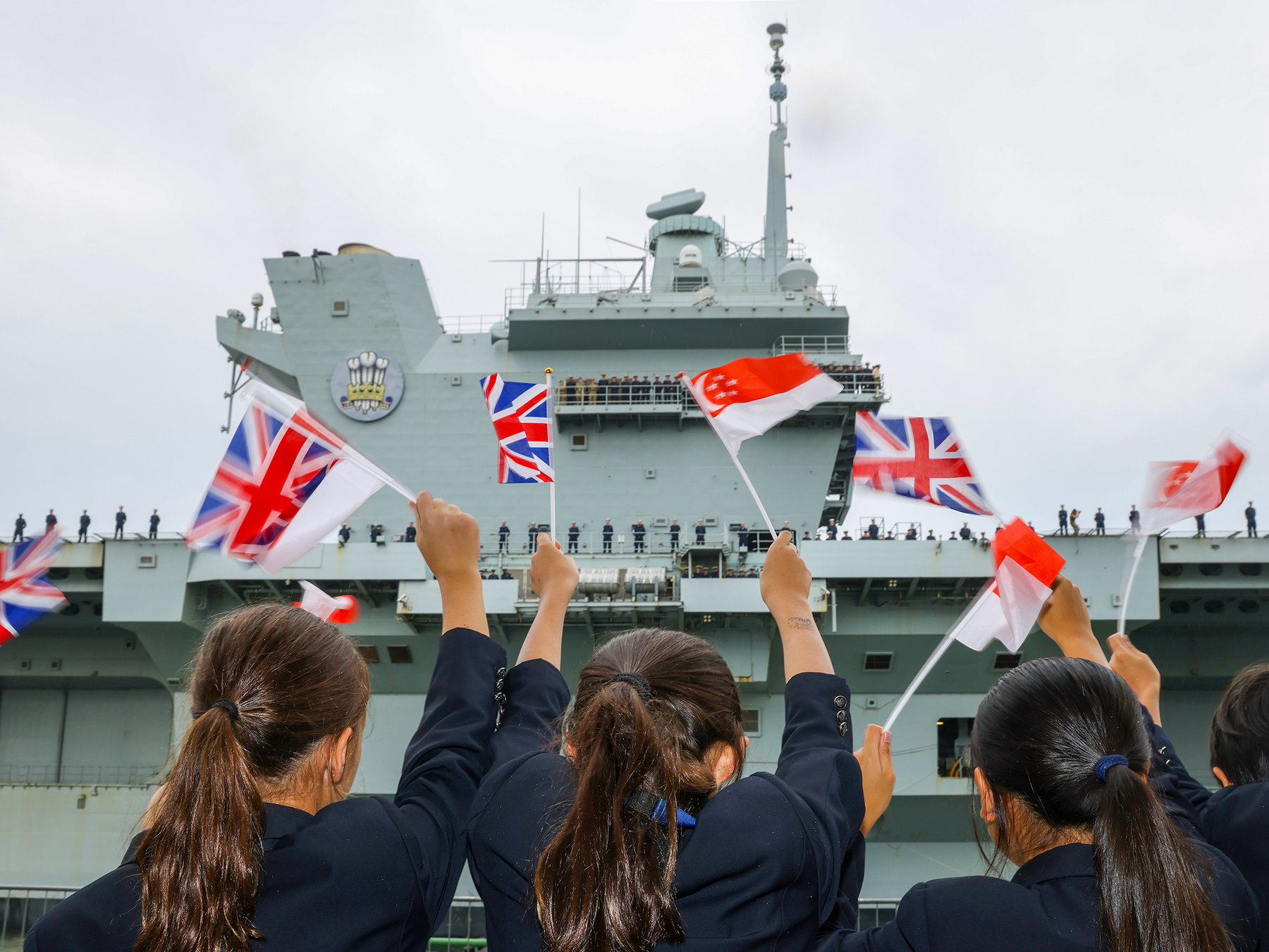 Aircraft Carrier HMS Prince of Wales sails into Singapore. The ships of the UK’s Carrier Strike Group arrive in South-east Asia.