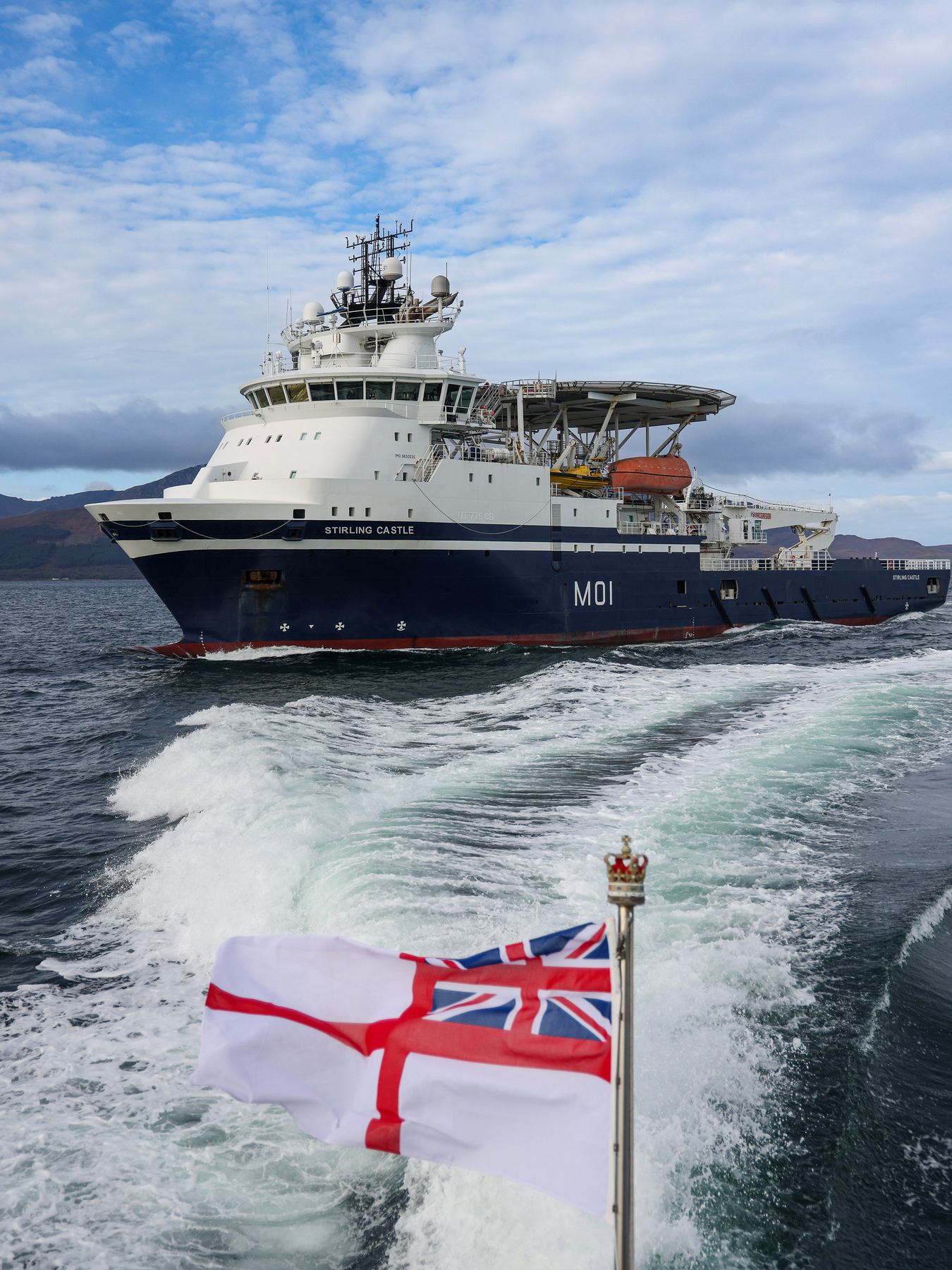 The Royal Navies latest ship mine countermeasures support vessel HMS Stirling Castle (M01) at sea in October 2025