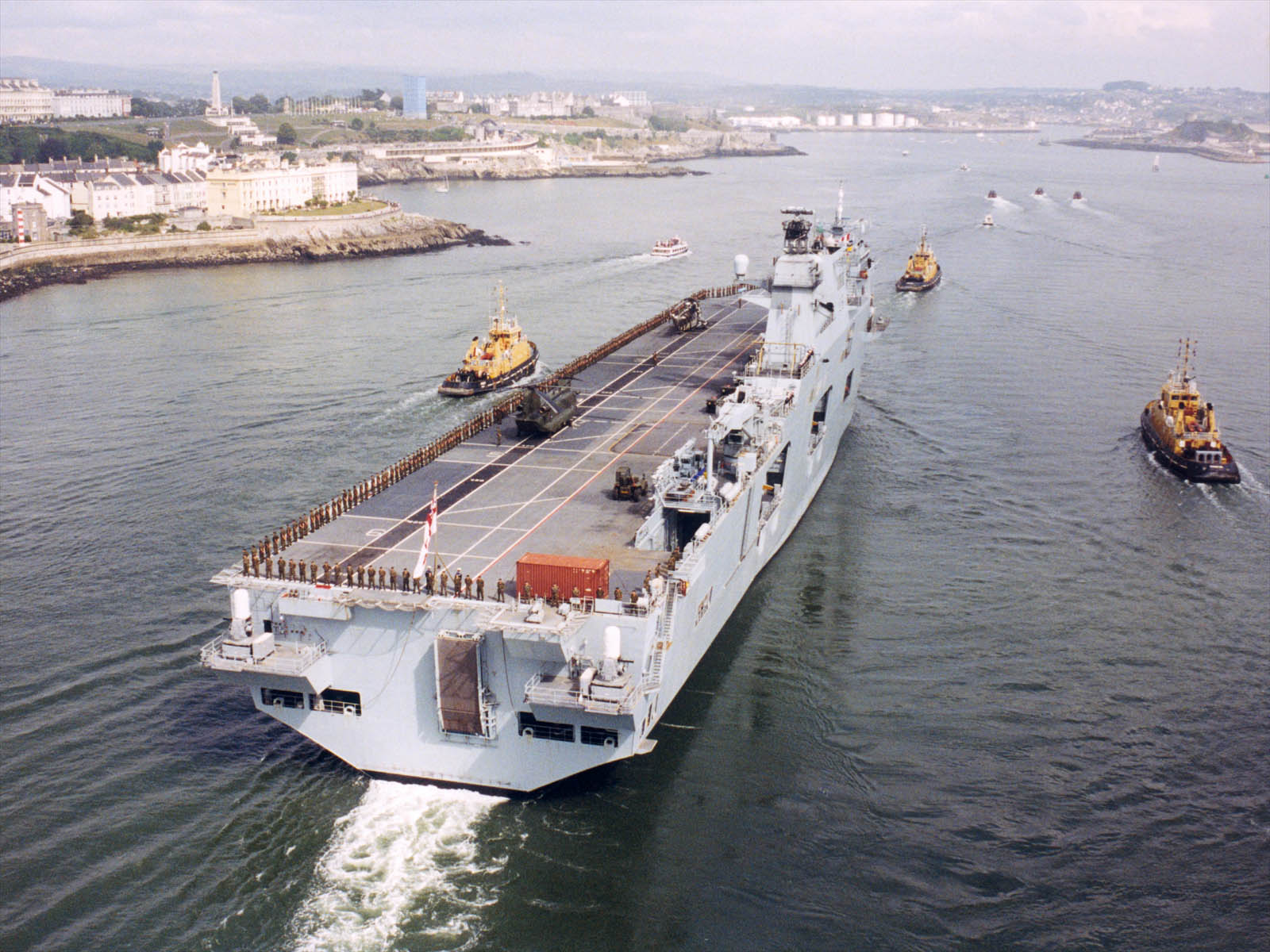 HMS Ocean (L12) departing Plymouth in full ceremonial order for her 3month trip to the Mediteranean and Gulf regions. She is part of a 24 strong maritime group that is taking part in exercises in the biggest maritime deployment since the Falklands. Her compliment of Royal Marine Commandos from 40 commando will join forces with various nations around the Gulf regions.