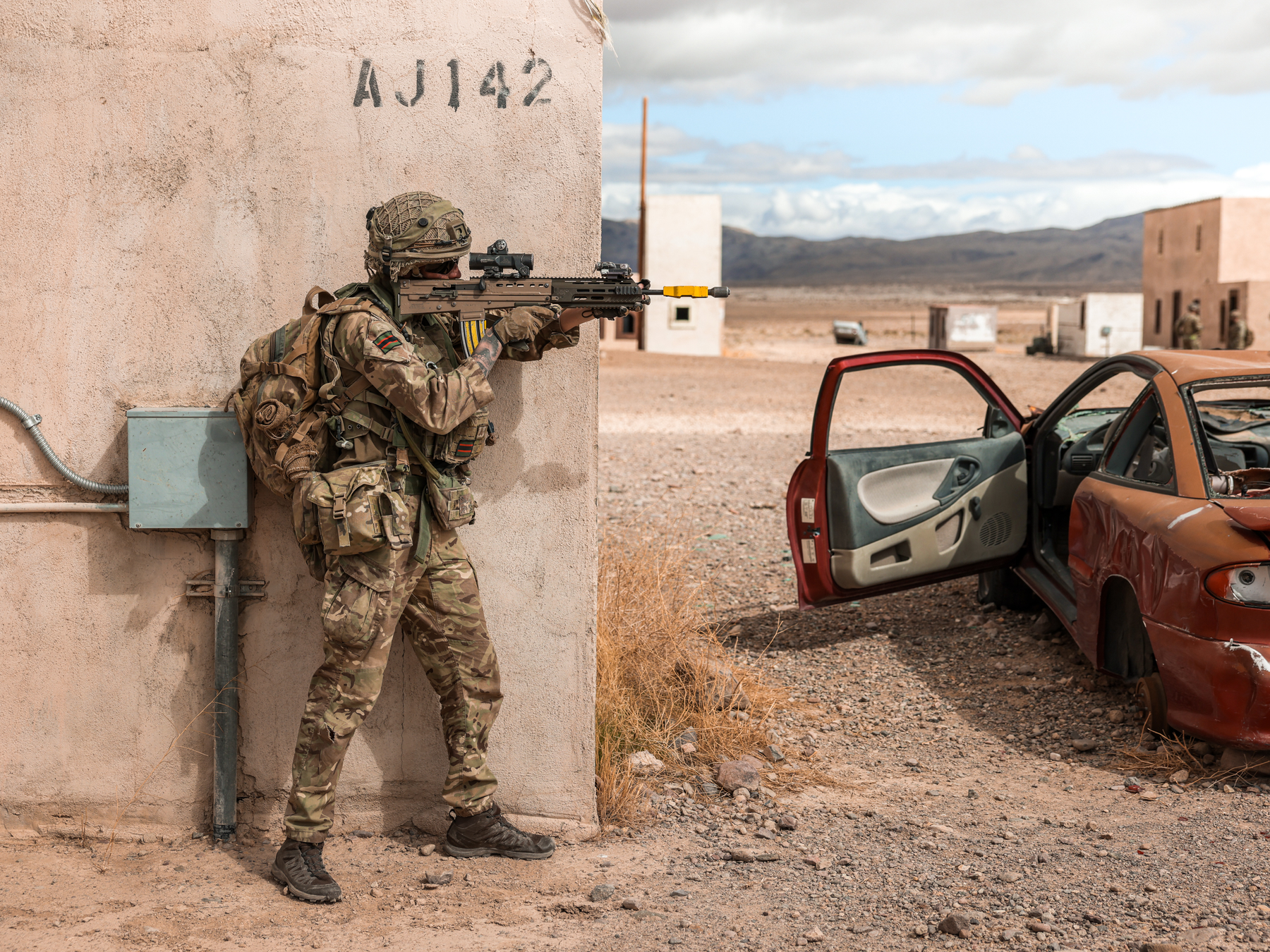 A British Army Soldier from 5 Rifles against the Wall in the supporting standing position during the assault on to the objective. On Wednesday 12th March 2025 2nd Battalion of the Yorkshire Regiment,5 Rifles and the Australian Army assaulted a village during exercise Project Convergence Capstone 5.